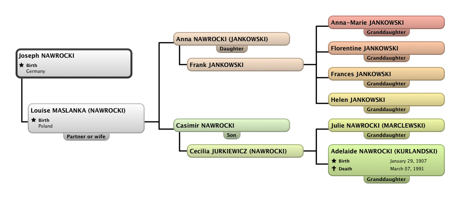 Mimi’s parents were Casimire Nawrocki and Cecilia Jurkiewicz. Their first child was Julie (or Julia), born somewhere around 1904. Adele, or Adelaide, was born 3 years later, on January 29, 1907. Here's a family tree that focuses just on Adele, her parents and her children, ignoring all siblings.
